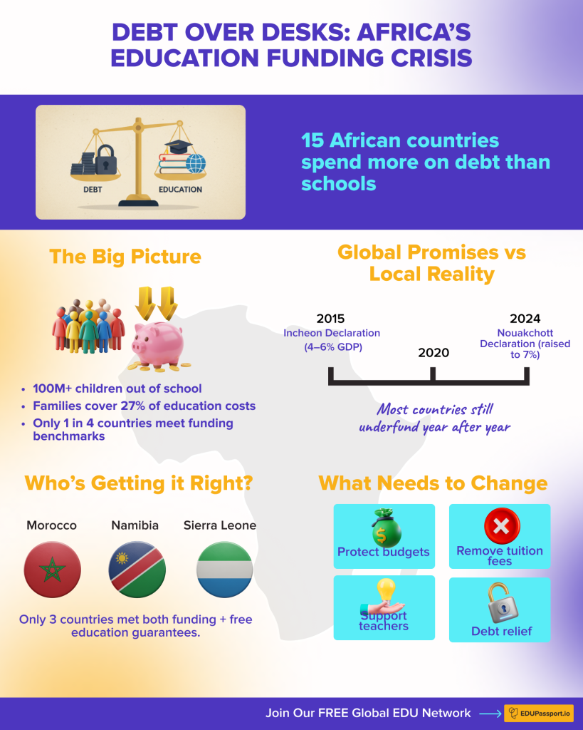 From the Incheon Declaration to the AU’s shiny new Nouakchott Declaration (which stretched the GDP benchmark to 7%), African leaders have been front-row cheerleaders for education. But in practice? Budgets are shrinking, tuition fees stick around, and families are left to foot the bill—covering 27% of education spending, according to the World Bank.